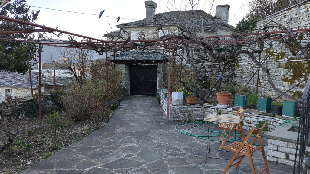 Our intention had been to camp but it’s cold, Jon has a thinnish sleeping bag and I’m scared of bears so we end up last minute in a very very very nice place in Koukouli. Maria (black clad ancient lady) appears several times with fresh spanakopita, Elisabeta and her sister appear with great cheer and fresh eggs.