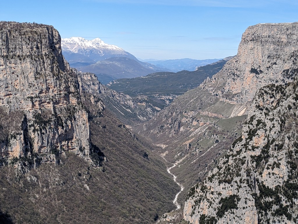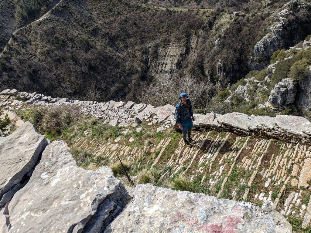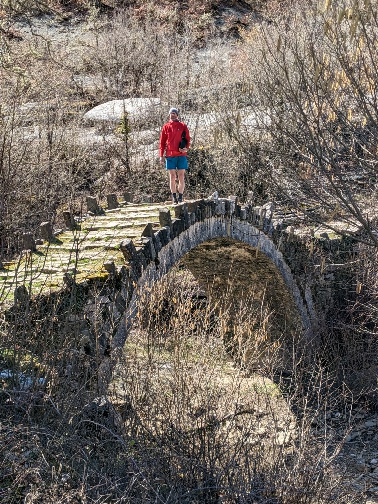 Off we head up an endless but steady and gentle climb. Amazing views of snow-covered mountains all around and what seems like an eternal “that must be the last bend”. It reminds Jon of sea kayaking past endless headlands. By this stage he is carrying so much more weight than me that we are actually quite matched in terms of pace. We finally do reach a bend that takes us back vaguely downhill (Col of the Women of Zagori statue 960m) into the Pindos Mountains National Park.