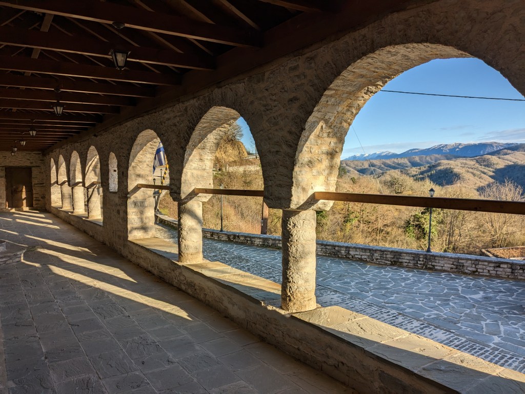 We leave Ioannina along the water edge. Jon likes the bus station we cycle past. It was a crazyplace. We escape the hail under a green grocer’s awning and then it’s into flattish land and onto byways between fields until crunch decision time in Karies. Do we go for the sights of Gjirokaster in Albania or into the wilds of the Pindos mountains? The latter hadn’t seemed that easy with snow lying quite low but after another epic picnic sitting on the curb next to some rubbish bins and barking dogs the wilds win over.