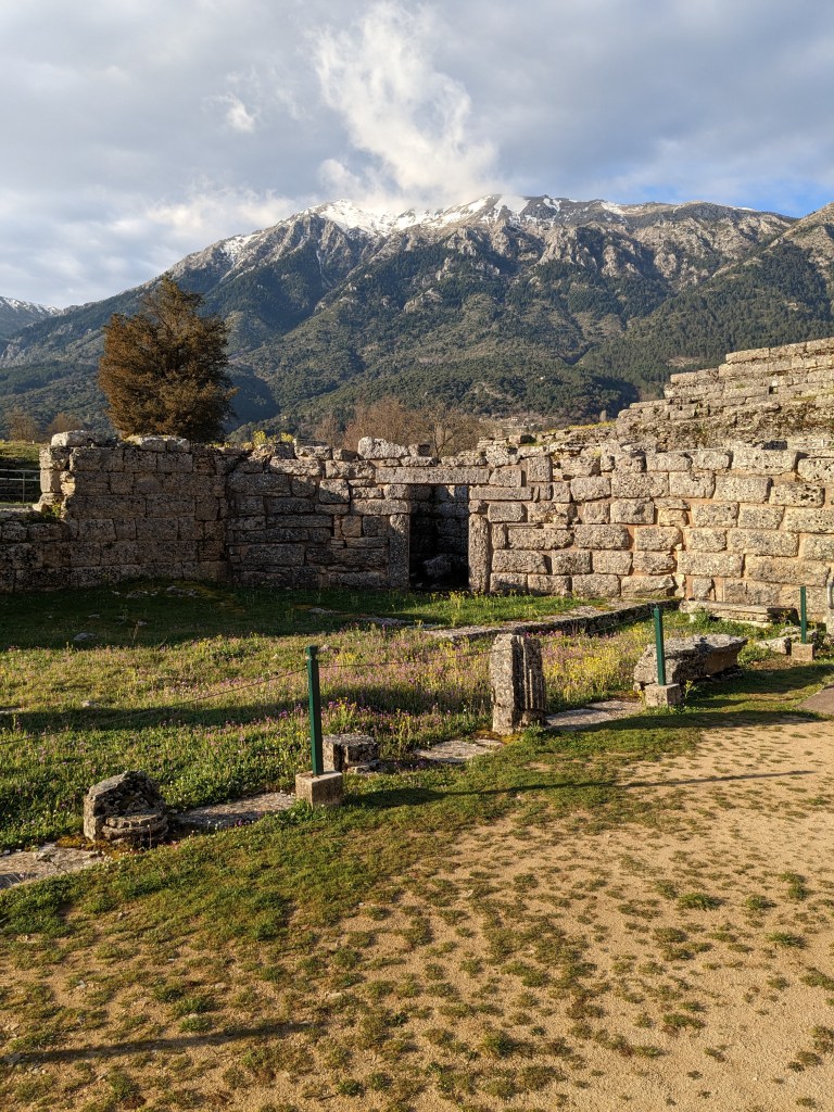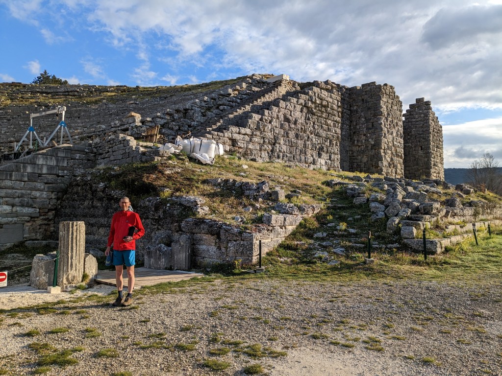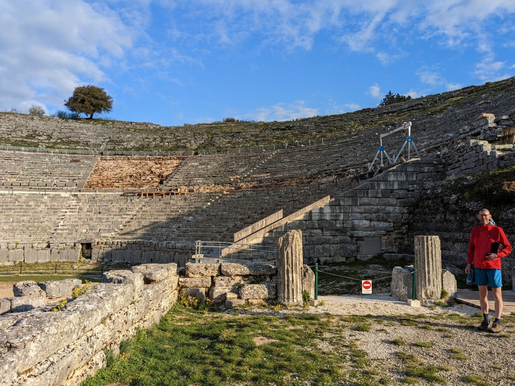 Then on to Dudoni archeological site. We get there early doors with all the archeologists arriving for work. We are delighted to see that our old friend Prof S Dakaris of Ioannina University 1950s-70s who figured prominently at all the previous sites we’ve been to gets a mention in the very high brow signs dotted around the site. Greeks take their archeology very seriously and both of us stand slack jawed trying to make sense of the signposts. We then give up and meander through the most ginormous amphitheater and columns just soaking it in.