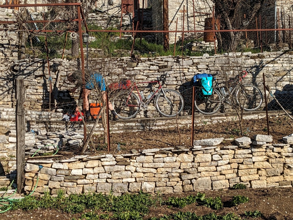 We are staying in a slightly shabby place on the high edge of town (bear anxiety still prevailing) and the heart sinks looking down at Konitsa extending right down into the plane at having to walk back up hill later tonight after food as we have truly eaten our panniers dry. As Jon bathes and does his laundry I sit on the terrace in the sunshine and the drabness melts away however. A very dapper Orthodox priest walks past tall and elegant and quite funky black trainers. Cats lie in the evening sun. An old man delivers a casserole dish to the next door neighbours. Another old man plants his lettuces in another garden next door.