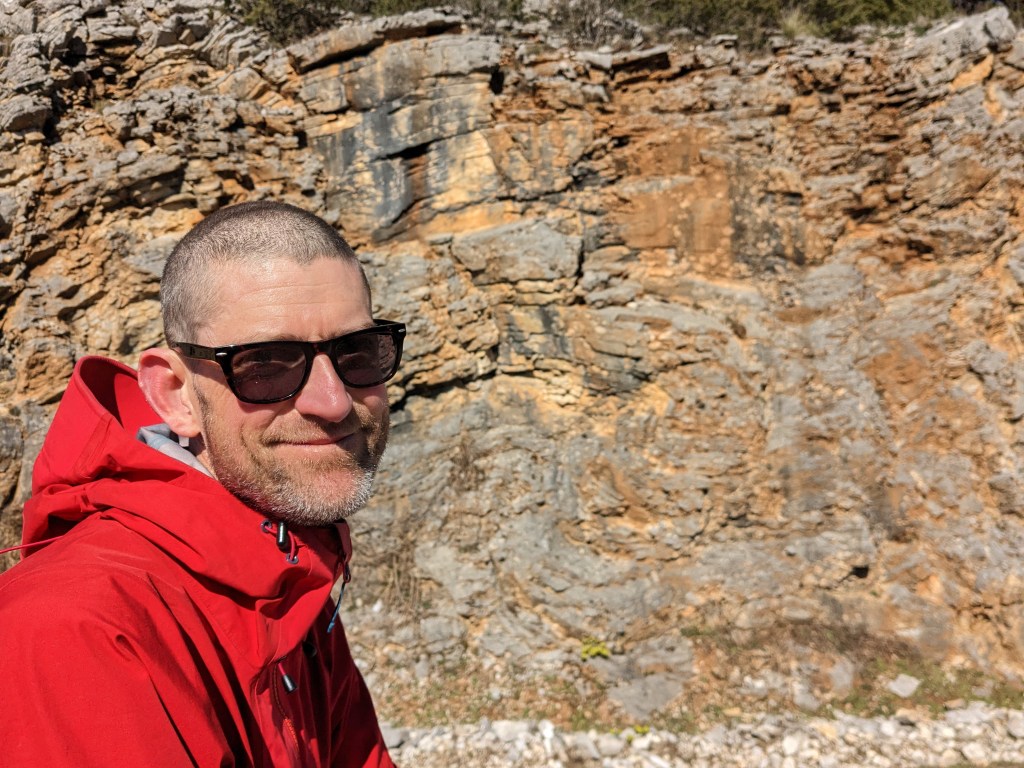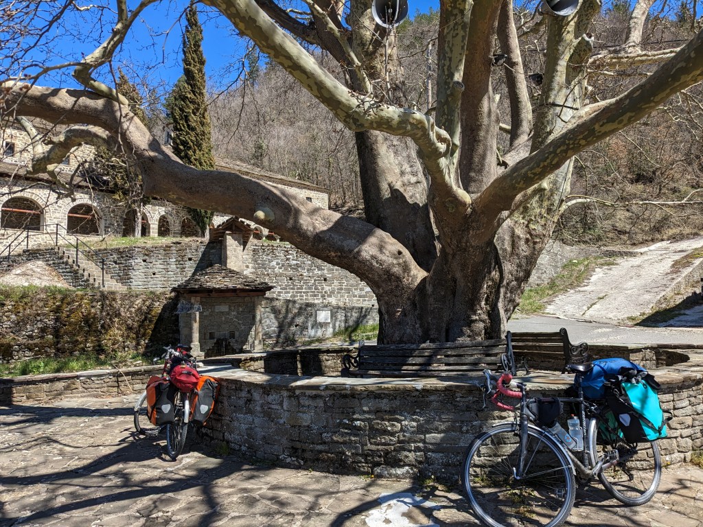 Lunch in a lovely village with tiled rather than stone rooves and the most enormous plane tree. The Aoos River a highlight. Then two proper climbs over 1000m, the second one catches me by surprise and just goes on and on and on (to over 1300m and level with the snow line on the opposite mountain). Multiple refuelling stops needed (the Last of the Pittas, cheese, sausage, the Last of the Figs, and the great Greek chocolate biccies) and eventually we drop down to amazing views of the flat river valley and Konitsa.
