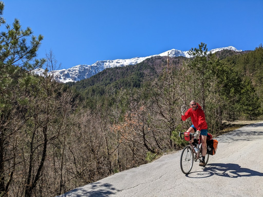 A day of remote up and down contouring in wild and beautiful mountain land – jagged snowy peaks not what I expected at all. The Bear Poo on the road turns out to be Cow Pat. Wild flowers and stubby oaks on the South and West facing mountain flanks, pine and landslides on the East and North. We cycle up what Kosta from Ioannina called Gypsy Valley and cross two cars and two logging trucks all day. It’s really very cold out of the sun, maybe 5°C.