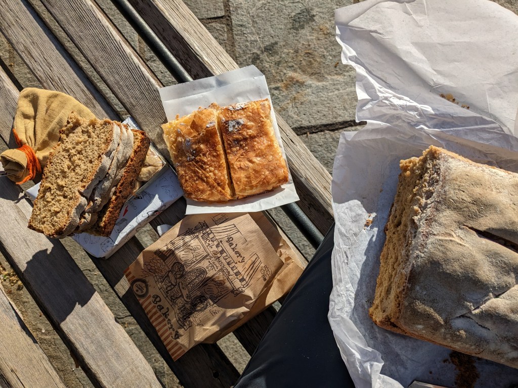 – very courteous drivers on empty roads; high mountain scenery; incredibly friendly; little extra sweet things with coffee or at the end of a meal; the bakery products sweet and savoury; the mountain water (as good as Inverness water); the wild flowers and the trees (olive, oak, plane pine); the Adriatic – swimming in it, its coves, the blue of it; the citrus fruit – our tangelemons, the scrumped lemons, the oranges; the archeological remains and the old architecture (Greek, Roman, Byzantine, Ottoman); Ioannina; some very great conversations (Kosta, the restaurant owner in Konitsa) and some nice fellows travellers; finally, slowly starting to get a hang of quite how complicated Balkan history is and what a mark that had left on some of these villages and places.