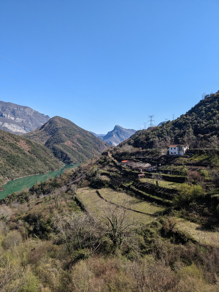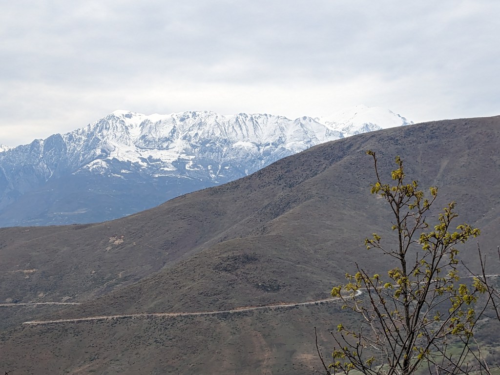 Less rubbish and it all looks rather Scottish particularly as we sit on the edge of a steep glen having second lunch looking down at a hidden vale. Forsythia in bloom everywhere and mini-euphorbia too. The Accursed Mountains finally appear – dead pointy and very very snowy and menacing looking. No messing with them. They’ll remain out of bounds for us because of the snow.