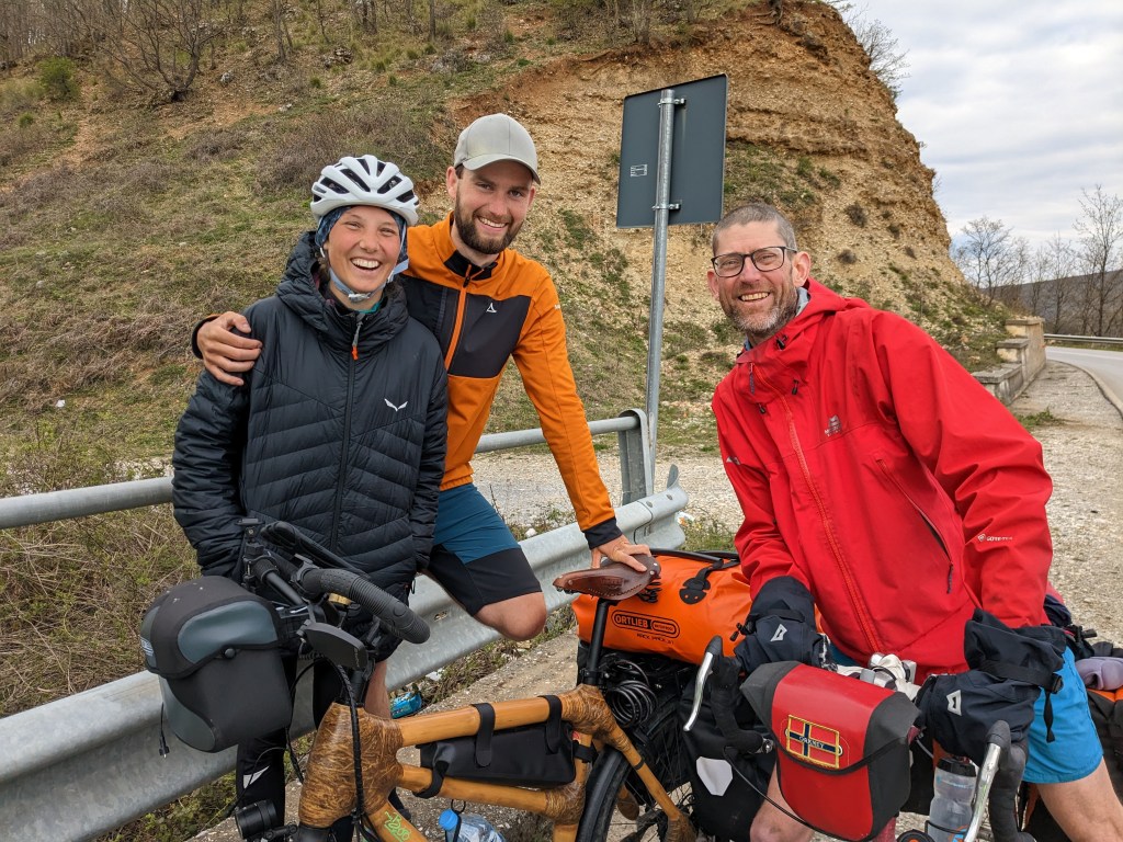 In the valley bottom we meet Franzi and Hans, a German Italian couple off to cycle the world on bamboo bikes. In their 20s (we feel OLD). Very sweet. They had lost a down jacket earlier in the day and were cycling back from the Kosovo border to look for it. We later find out that a local family helped them find it and gave them a bed for the night and the full hospitality. How special.