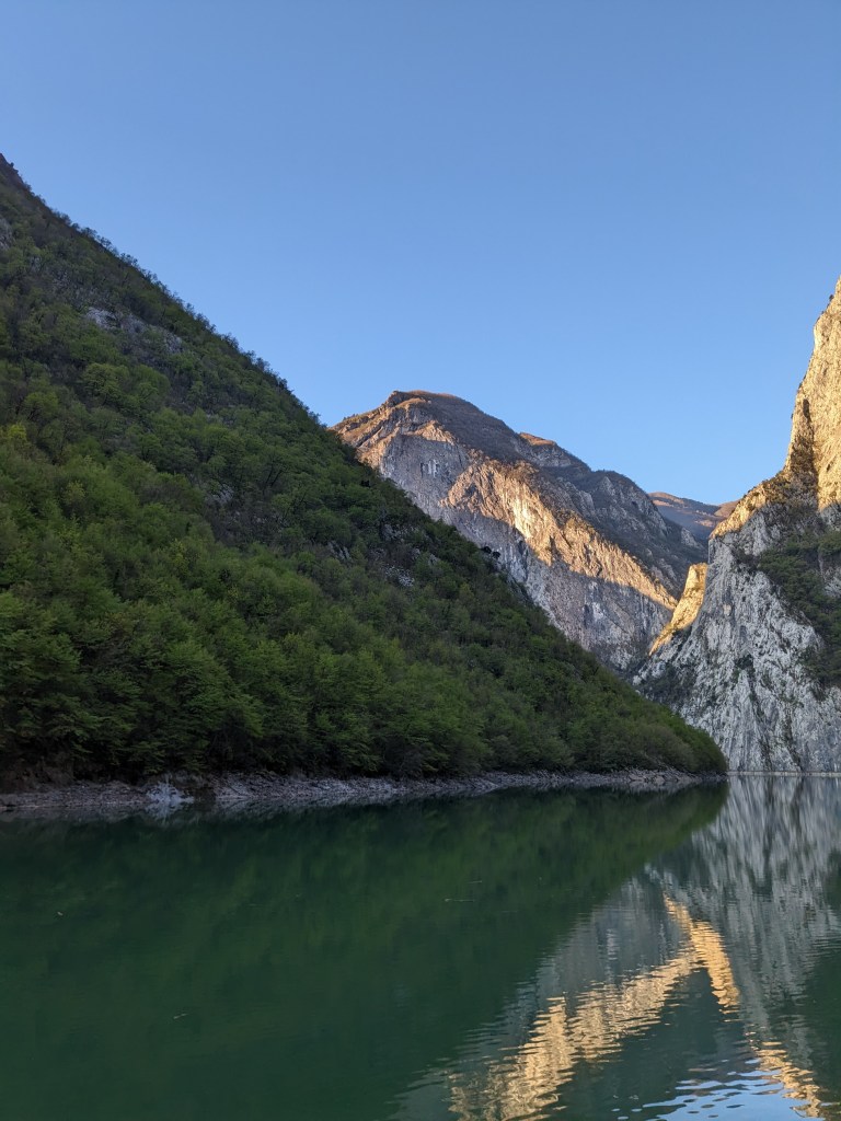 Before dawn the dogs get a’barking and that will be Shannon setting off to walk to the ferry terminal where we are also heading. I lie in bed and track her progress as the dog barks sounds more and more distant as she walks down through the village. Niiightriiiiiide for us with a second dogbark chorus and muezzin calls and just before 6 we all load onto the Lake Koman ferry for a 2.5 hour boatbus trip through the staggering staggering gorge. Jon and I layer up and remain outside for the whole trip gradually getting colder and colder apart from shards of sunshine and marvel at the remote settlements on the steep banks whose only connection to the outside world is this boat. The skillful skipper zooms in to pick up villagers with their sacks of wares for the market, dropping off humans and animals in other places. A lovely French family, grandad living in Tirana, cool dude water engineer, also on board, and we chat and marvel together at the sheer cliffs and stupendous beauty. Diesel boat engine smells remind me of my old boat days. It’s all mighty fine. We disembark in a mad dash of sacks bikes people scrabbling to get on and off the boat, and after a short tunnel spend half an hour warming up in the sunshine with second breakfast before hitting a 30km broken up but beautiful road above the reservoir. Jon finds this hard hard, I love it. My bike comfier on this terrain than his.