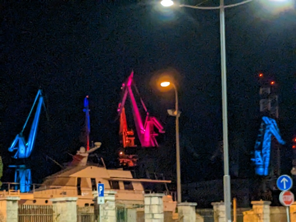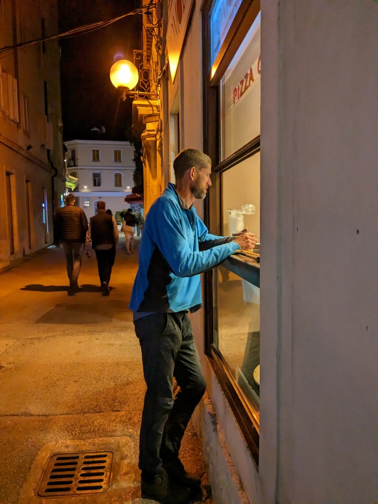 We get off the ferry in Pula at night and cycle along the harbour with the port cranes all illuminated in multi colours (it’s super cool and it’s an artist what did it) and head for a friendly hostel, then immediately out for FOOD. Only a kebab will hit the spot, so kebab it is, us queueing with all the teenagers. Then an ice cream chaser, and Jon who has started auto-dissolving had pizza in between.