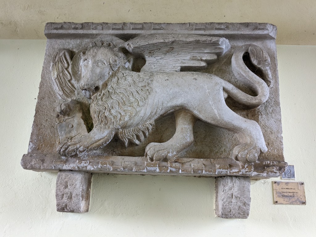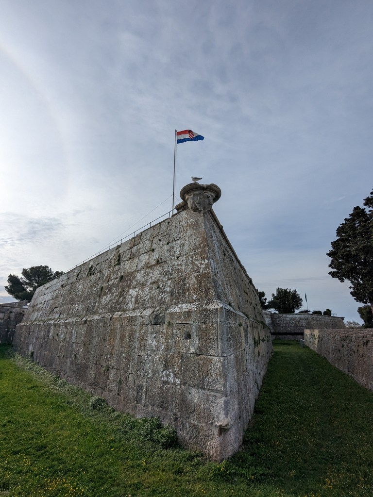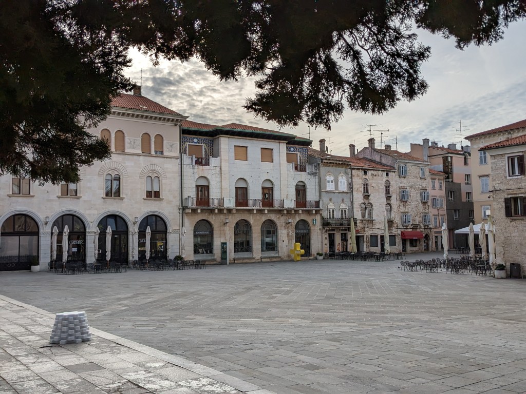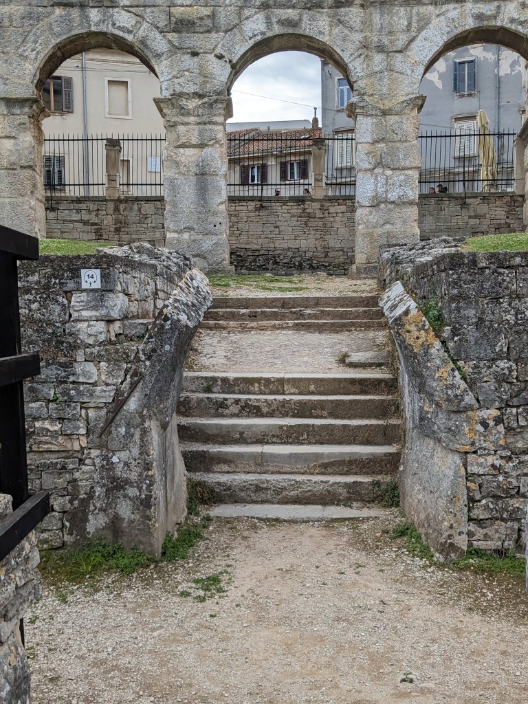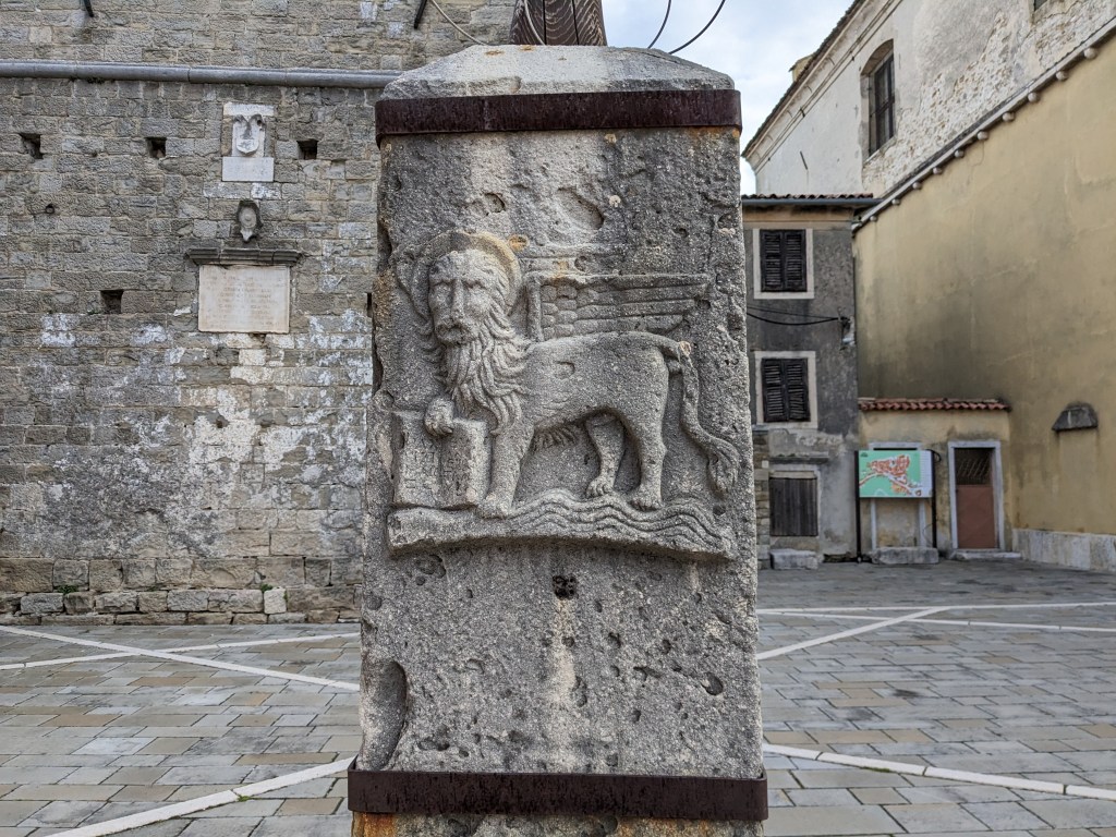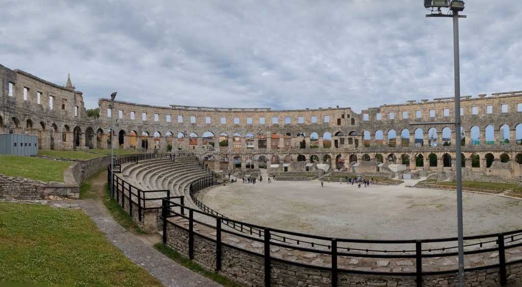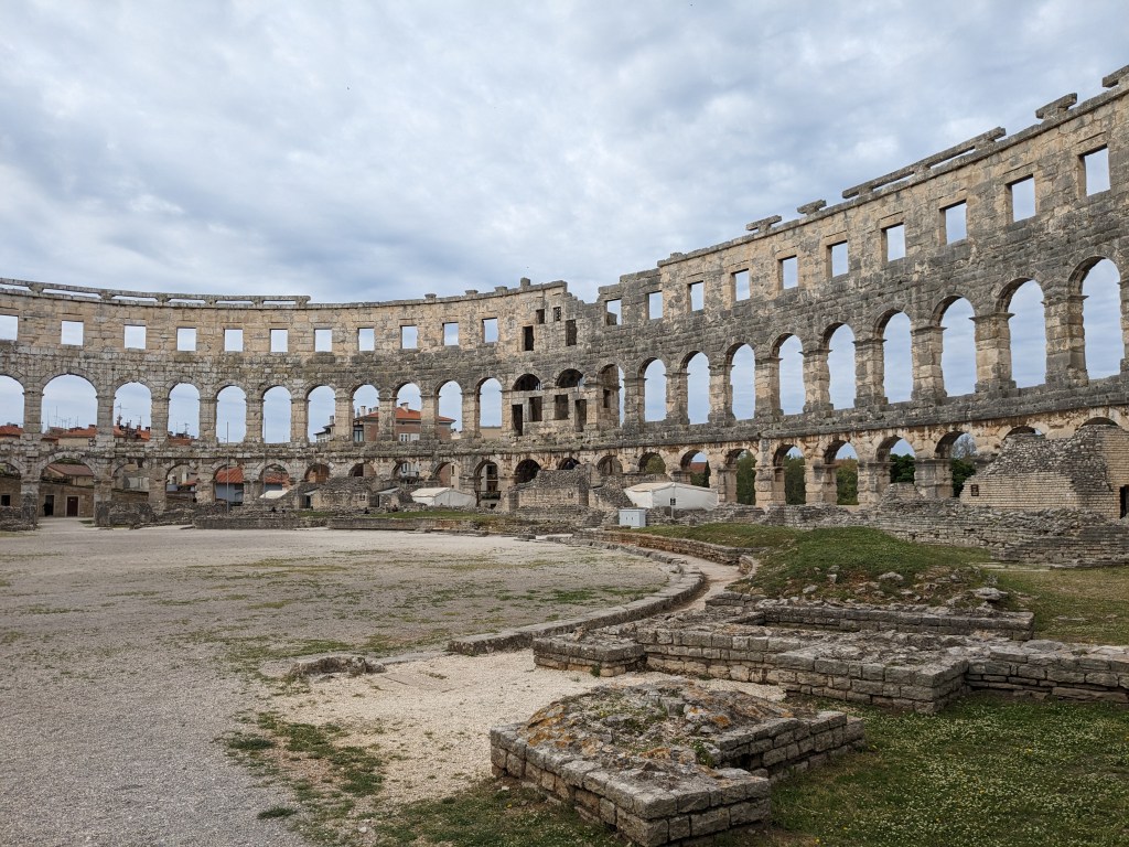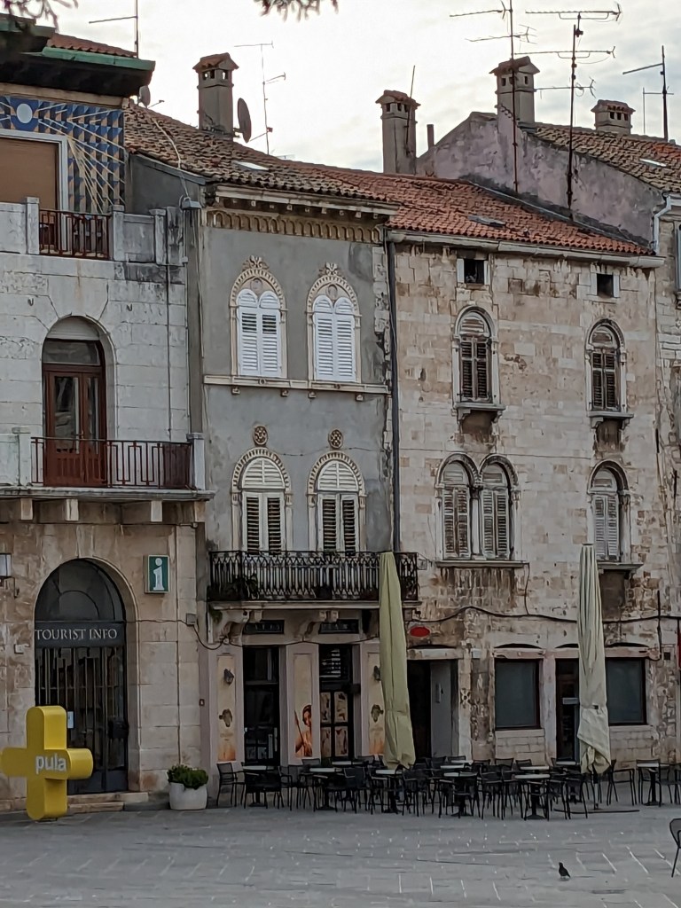 By day Pula is lovely. It’s a big old working port but it’s also full of interesting things to see – a big old Roman oblong amphitheater, a big old Greek temple, many fine buildings, some old mosaics. It isn’t overrun with tourists and we both love it. By midday it’s back on the bikes and off we head into what seems to be a constant headwind.