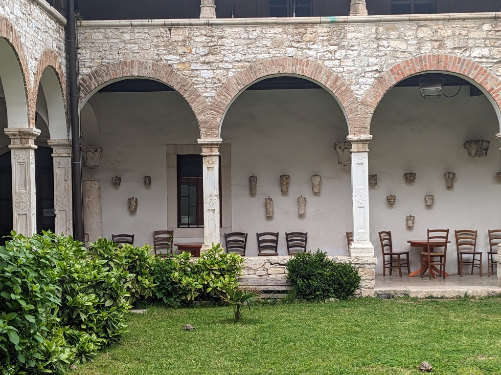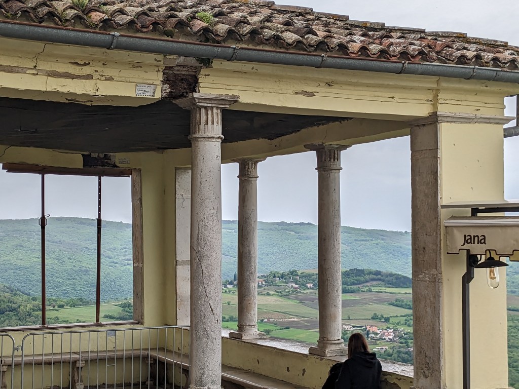 Motovun is touristy and pretty and perched on a hill top, an old fortified village. We have our second breakfast in an elegant cloistered area with a greedy cat and fine views.