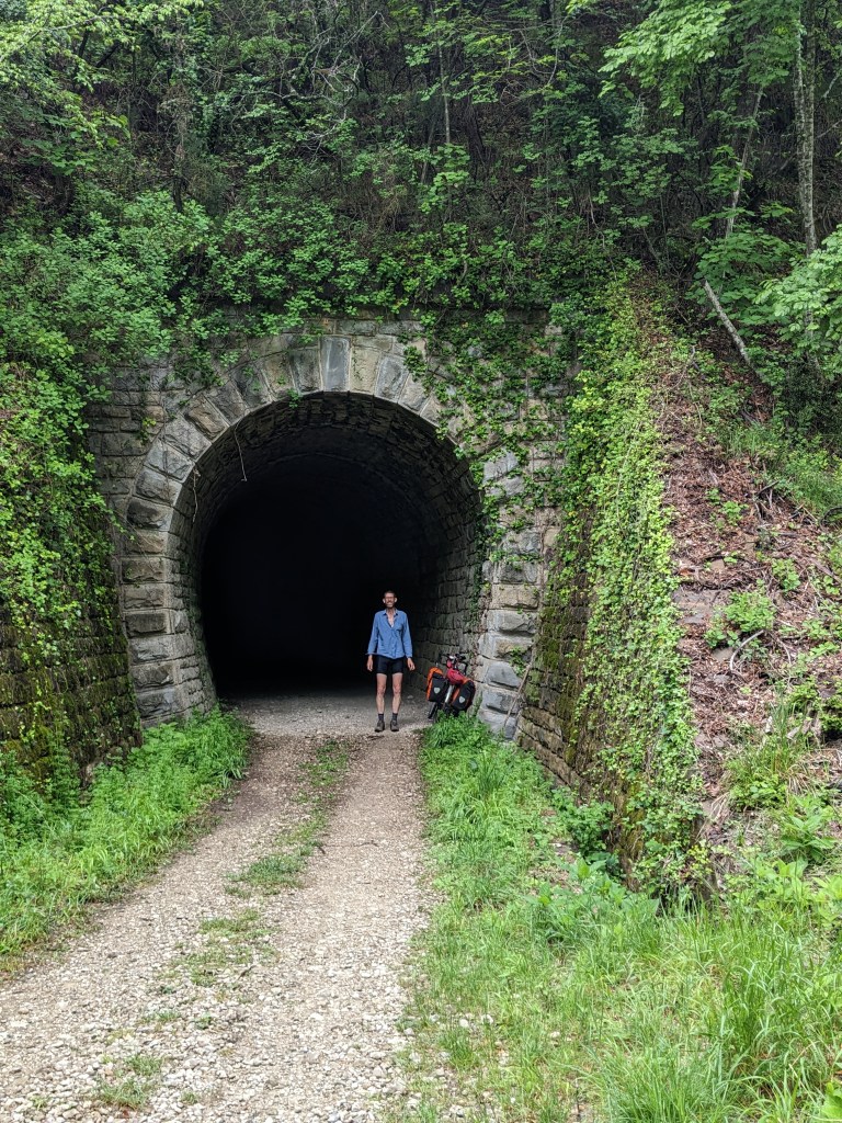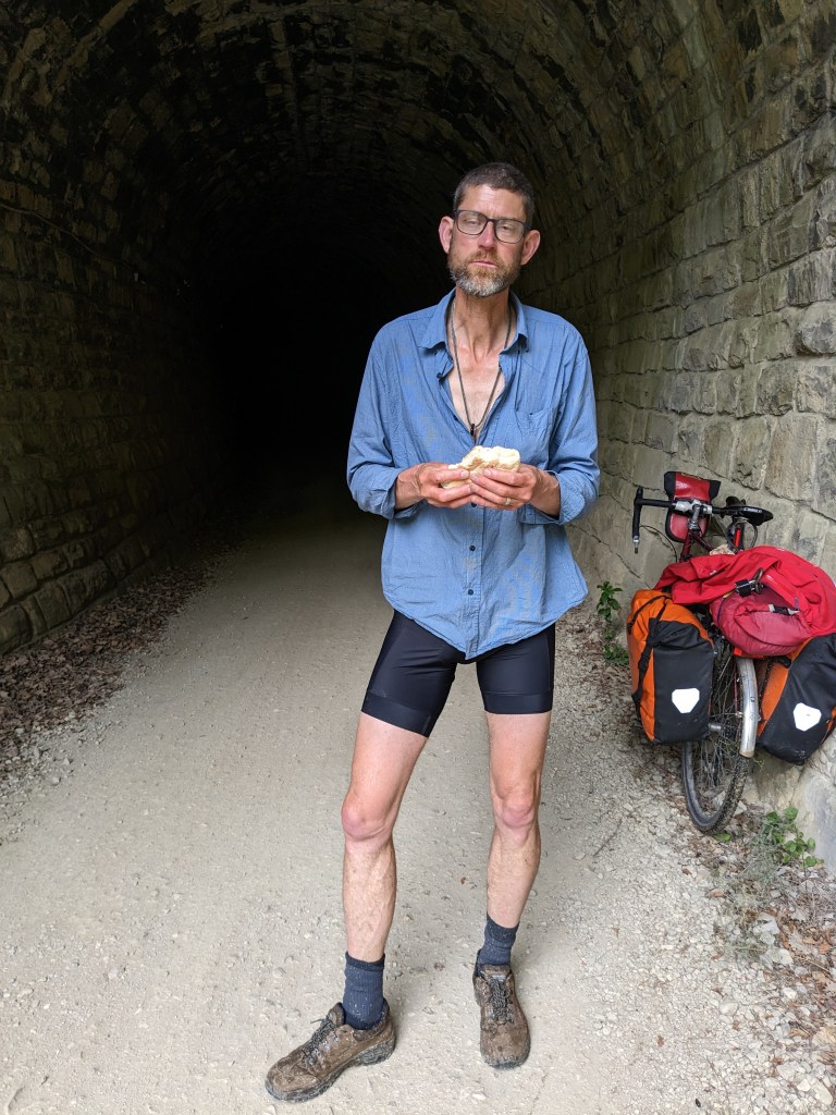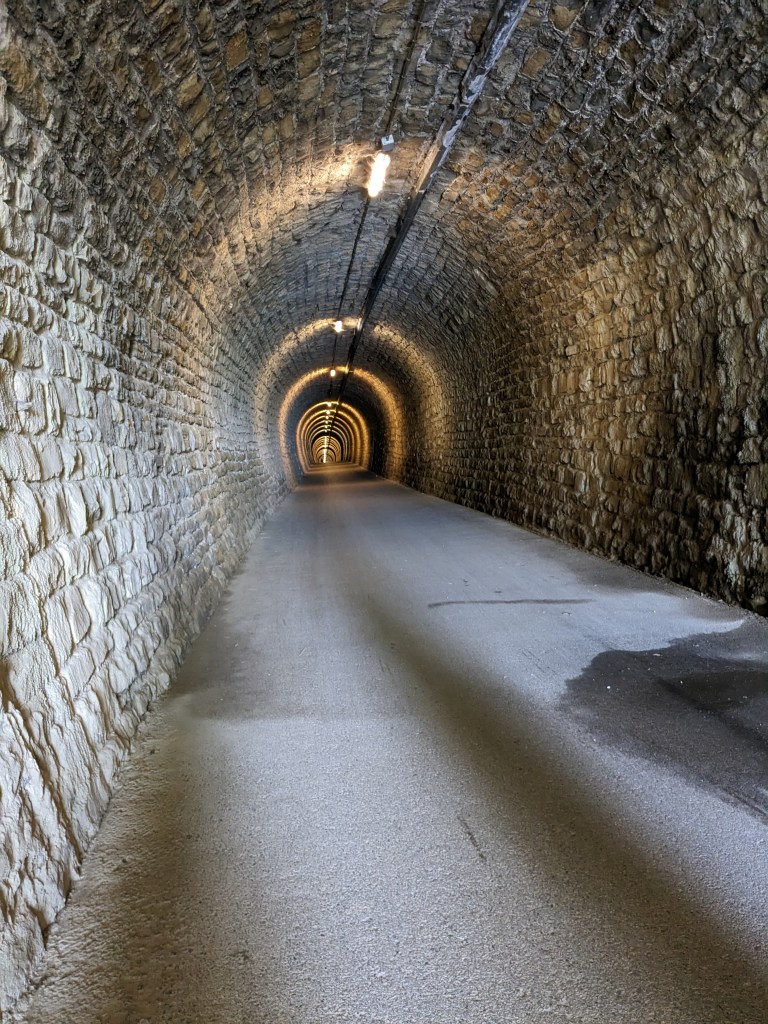 The landscape has really changed over the two days and we leave behind sun-beaten polje scrub oak land and it all suddenly feels very middle European. We join the Parenzana cycle trail, an old railway line that goes from Porec to Trieste and it’s totally ace. We join just at the section that takes you up a steady climb out of the deep valley through tunnels and over viaducts and past villages. It’s all dripping greenery and so lush and verdant. It’s mainly gravel and well maintained and just a joy to ride.