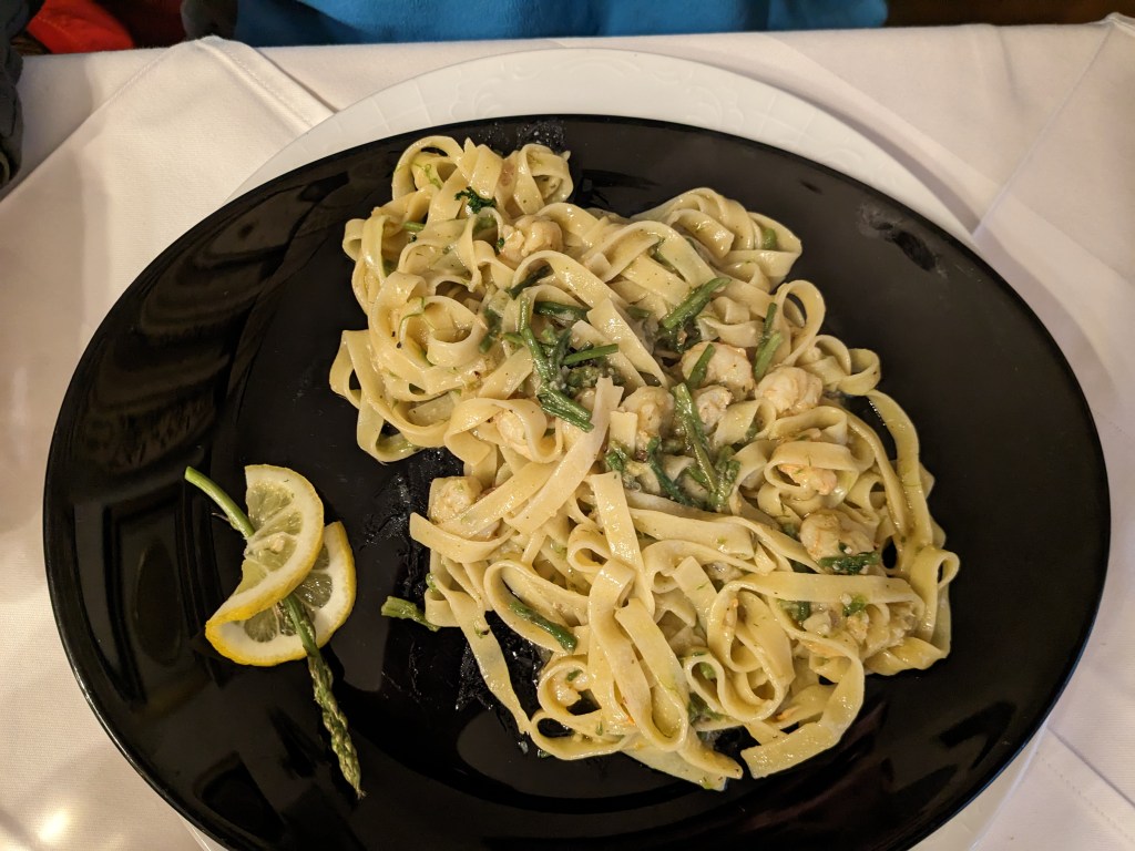But it does allow us to dry everything out under cover as it’s still chucking it down, and wash, and walk 3km to the next village where we have the Full Istrian Amazing food at an unprepossessing looking but very very friendly and very delicious trattoria. I’m in food ultra-heaven. This is part of Rosemary and Clive’s Christmas treat and it’s very special. It involves a lot of seafood and wild asparagus which we finally managed to find by the road side earlier as well. On a pee theme, wild asparagus doesn’t make your pee smell like farmed asparagus.
