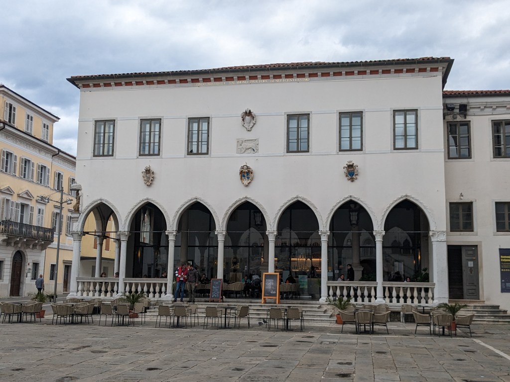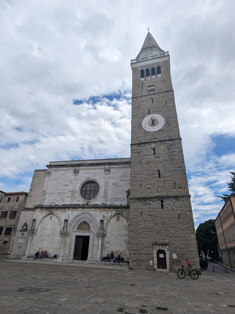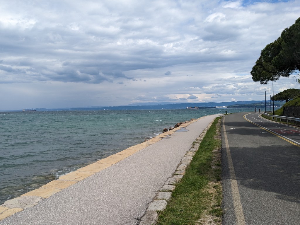 Great views down on the sea and along a lovely coastal cycle route with only joggers and bikes and all headwind bora and ships out at sea, we stop in Koper for the tourism – old 15th C Venetian palazzos, big church, winding streets, but still a workaday feel about it with a busy port. Great ice cream. A bit of a footle leaving town and suddenly boom we are in Italy, tarmac quality goes down, cycle route joins the dual carriageway (gulp) but cars are respectful and it’s not remotely scary just a long drag into Trieste through industrial suburbs on dual carriageway. Both v excited at reaching Trieste so it gets its own section. We reach Trieste at last, after roughly 10 years of talking about a Greece to Trieste trip, we have made it at last with No Domestic Accidents!
